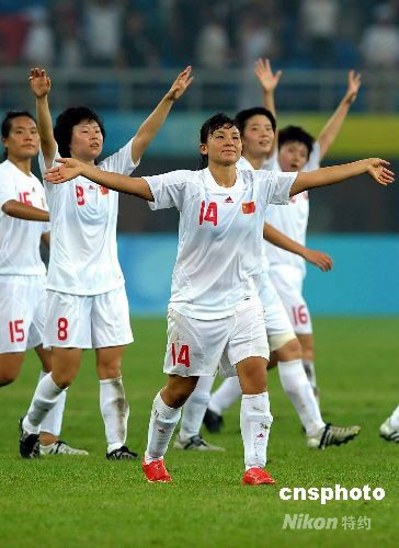 8月6日,北京奧運(yùn)會(huì)女足小組賽首輪比賽全面打響,中國(guó)女足19時(shí)45分在天津奧林匹克球場(chǎng)迎戰(zhàn)瑞典隊(duì),最終經(jīng)過90分鐘鏖戰(zhàn),中國(guó)女足憑借徐媛和韓端的進(jìn)球,以2:1擊敗對(duì)手。賽后“鏗鏘玫瑰”們歡慶勝利。中新社發(fā) 陳文 攝