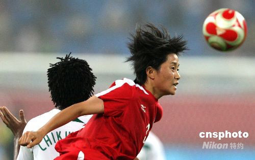 8月6日,北京奧運(yùn)會(huì)沈陽(yáng)足球分賽場(chǎng)女足預(yù)賽,朝鮮1:0戰(zhàn)勝尼日利亞隊(duì)。圖為朝鮮隊(duì)OM Jong Ran頭球爭(zhēng)頂。 中新社發(fā) 張宇 攝