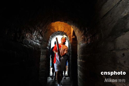 8月7日上午,奧運火炬在北京八達嶺長城傳遞,第8棒火炬手顧崇華手持燃燒的奧運火炬穿越烽火臺。 中新社發(fā) 廖攀 攝