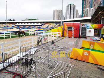 臺風(fēng)“北冕”把香港奧運(yùn)馬術(shù)沙田主場地旁的記者區(qū)裝飾物,吹得東倒西歪。(圖片來源:文匯報(bào))