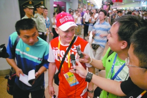 一直在首爾參加熱身賽的俄羅斯跳水隊8月4日有4名隊員到達,昨日,剩余的6名隊員全部到達北京。等待薩烏丁的過程中,不斷地有志愿者對記者說:“等下能幫忙找薩烏丁要個簽名嗎?”而且,這次追星的人群不再是年輕人的天下,一些中年人也參與到簽名、合影的陣營之中。