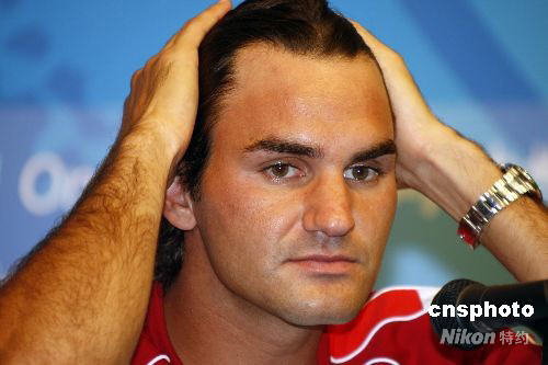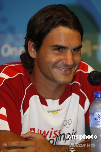 8月7日,瑞士網(wǎng)球天王羅杰·費德勒在北京奧運新聞中心召開發(fā)布會。費德勒將在8月8日開幕式當(dāng)天度過自己27歲生日。 中新社發(fā) 杜洋 攝