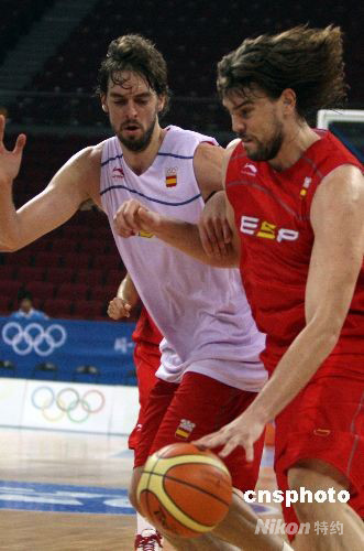 8月7日,世界冠軍西班牙男籃在北京奧運會籃球比賽館——五棵松籃球進行賽前的最后一場熱身訓練,效力于NBA洛杉磯湖人隊的超級球星保羅·加索爾(左)與弟弟馬克·加索爾率領球隊演練戰(zhàn)術。中新社發(fā) 任晨鳴 攝