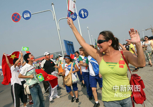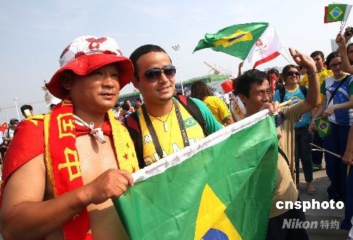 8月7日,巴西、中國球迷在北京奧運沈陽足球分賽場歡呼。當晚,男足巴西對比利時、中國對新西蘭將進行小組賽。中新社發(fā) 張宇 攝