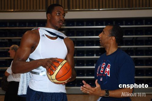 8月7日中午,美國男籃“夢八隊(duì)”開始了抵京后的首次訓(xùn)練。圖為“魔獸”中鋒霍華德與發(fā)球教練進(jìn)行交流。中新社發(fā) 賴松 攝
