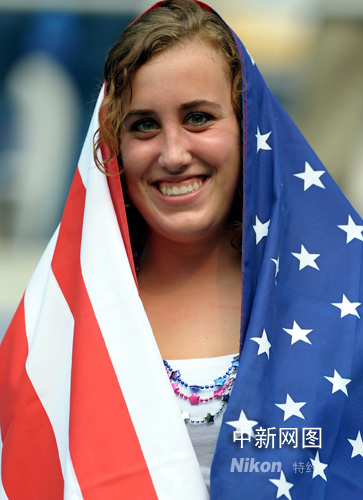 圖:美國女球迷身披國旗助威