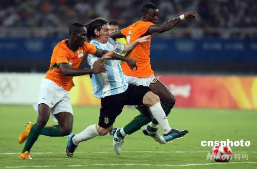 8月7日,北京奧運(yùn)會(huì)上海足球分賽場男足預(yù)賽,在衛(wèi)冕冠軍阿根廷對(duì)陣科特迪瓦的比賽中, 阿根廷以2:1取勝迎來開門紅,球星梅西(MESSI Lionel)為阿根廷攻入本屆奧足賽首粒進(jìn)球。圖為梅西帶球從人縫中突破。 中新社發(fā) 湯彥俊 攝
