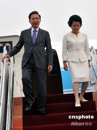 韓國(guó)總統(tǒng)李明博8月8日上午9 時(shí)許抵達(dá)北京,將出席北京奧運(yùn)會(huì)開(kāi)幕式及相關(guān)活動(dòng)。 中新社發(fā) 宋吉河 攝