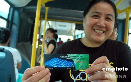 8月8日,北京奧運會開幕日,北京公交集團(tuán)公司在所屬線路車上發(fā)售奧運會開幕紀(jì)念公交車票。據(jù)了解,奧運公交紀(jì)念車票分四種票樣,在不同線路車上發(fā)售,因數(shù)量有限,紀(jì)念票售完后仍出售現(xiàn)行普通票。圖為乘客高興地展示買到的奧運紀(jì)念車票。中新社發(fā) 張雙雙 攝