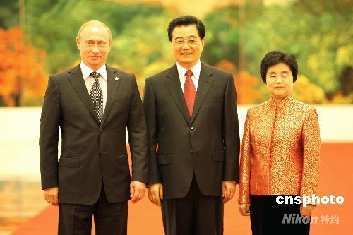8月8日中午,中國(guó)國(guó)家主席胡錦濤和夫人劉永清在北京人民大會(huì)堂為出席北京奧運(yùn)會(huì)的貴賓舉行歡迎宴會(huì)。圖為胡錦濤夫婦歡迎俄羅斯總理普京。中新社發(fā) 任海霞 攝