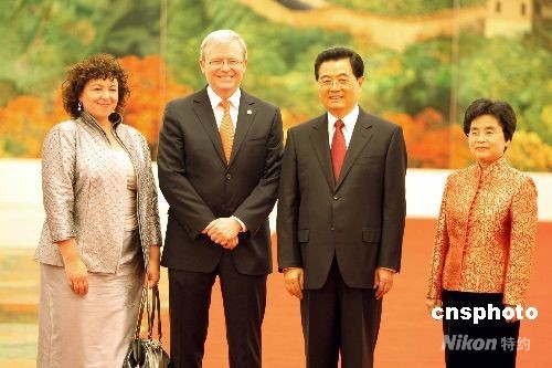 8月8日中午,中國國家主席胡錦濤和夫人劉永清在北京人民大會堂為出席北京奧運會的貴賓舉行歡迎宴會。圖為胡錦濤夫婦歡迎陸克文夫婦。中新社發(fā) 任海霞 攝