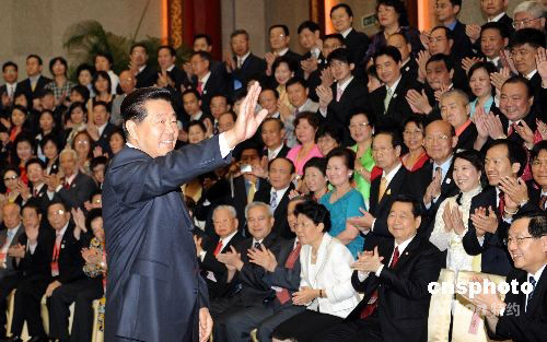 8月8日,中共中央政治局常委、全國政協(xié)主席賈慶林在北京釣魚臺(tái)國賓館會(huì)見出席北京奧運(yùn)開幕式的近200位華人華僑代表。中新社發(fā) 廖攀 攝