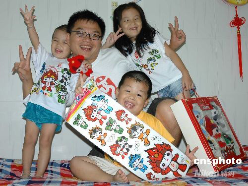 8月8日,越南胡志明市的華人在奧運(yùn)開幕之際,身著印有北京奧運(yùn)標(biāo)志和吉祥物福娃的服裝,祝福北京奧運(yùn)。據(jù)悉,這些服裝和吉祥物是華人專門到中國廣西購買的。中新社發(fā) 楊巧笑 攝