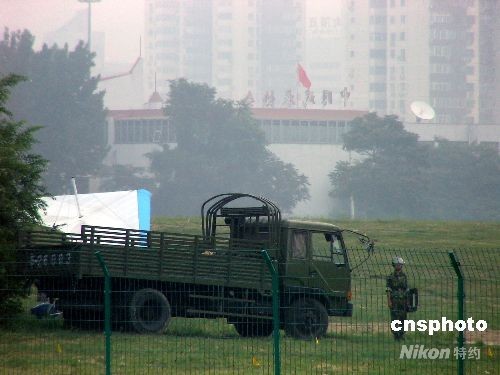 8月8日,新駐“鳥巢”周圍的中國武警防暴部隊(duì)嚴(yán)陣以待,保衛(wèi)北京奧運(yùn)會開幕式的安全。包括解放軍三軍將士和保安、民兵、警察和武警在內(nèi)的多支武裝力量在此駐守,維護(hù)“鳥巢”周邊地面安全。中新社發(fā) 賈國榮 攝