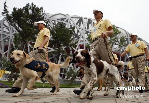 8月8日,第29屆夏季奧運會將于當晚在北京奧林匹克公園內(nèi)的國家體育場開幕,為保證開幕式的順利進行,“鳥巢”周邊安保措施升級。圖為搜爆犬在“鳥巢”周邊搜爆。