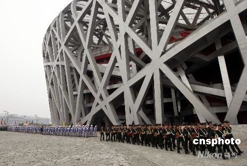 8月8日,第29屆夏季奧運會將于當晚在北京奧林匹克公園內的國家體育場開幕,武警進駐“鳥巢”周邊警戒崗位。中新社發(fā) 杜洋 攝