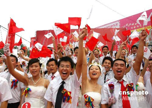 2008年8月8日,山東濱州50對(duì)新人齊聚廣場(chǎng),手舉奧運(yùn)旗幟高呼“中國(guó)加油、奧運(yùn)加油”,與祖國(guó)同慶,與奧運(yùn)同慶。中新社發(fā) 梁寶海 攝