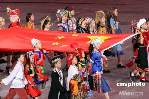 第二十九屆夏季奧運(yùn)會(huì)8月8日晚在北京奧林匹克公園內(nèi)的國家體育場舉行開幕式,中國各民族兒童簇?fù)碇r艷的中國國旗入場。 中新社發(fā) 任晨鳴 攝