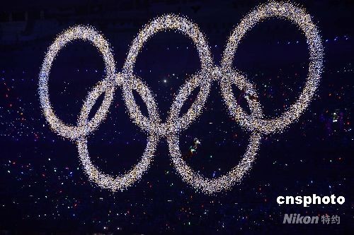 8月8日晚8時(shí)8分,第二十九屆夏季奧運(yùn)會(huì)在北京的國家體育場--鳥巢隆重開幕。五環(huán)圖案在北京“鳥巢”內(nèi)閃耀。中新社發(fā) 任晨鳴 攝