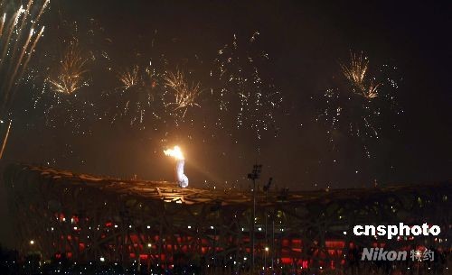 8月8日,第29屆夏季奧運(yùn)會(huì)在北京奧林匹克公園內(nèi)的國家體育場“鳥巢”舉行。李寧點(diǎn)燃北京奧運(yùn)會(huì)主火炬,奧運(yùn)圣火在鳥巢上空熊熊燃燒。中新社發(fā) 盛佳鵬 攝