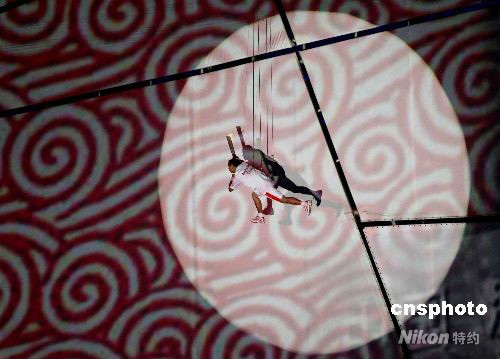8月8日,第29屆夏季奧運(yùn)會(huì)在北京奧林匹克公園內(nèi)的國家體育場“鳥巢”舉行。中國“體操王子”李寧飛繞“鳥巢”一周后點(diǎn)燃主火炬。 中新社發(fā) 任晨鳴 攝