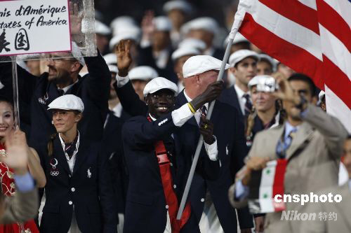 圖為美國旗手洛佩茲·拉蒙和美國奧運代表團入場。 中新社發(fā) 杜洋 攝