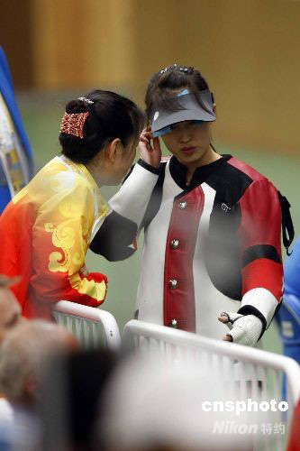 8月9日,北京奧運(yùn)會開賽的第一天,女子10米氣步槍資格賽率先在北京射擊館拉開戰(zhàn)幕。30多個(gè)國家的47名選手在17到63號靶位比試槍法;資格賽前八名進(jìn)入最后決賽。中國選手趙穎慧只打出389環(huán)未能晉級決賽。圖為趙穎慧在請教教練。 中新社發(fā) 盛佳鵬 攝