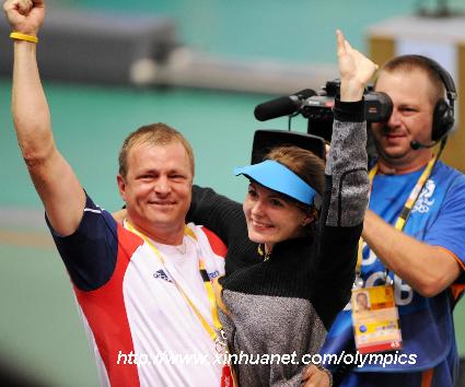 北京,2008年8月9日射擊——卡·埃蒙斯奪得北京奧運(yùn)會(huì)首金 8月9日,捷克選手卡·埃蒙斯(中)與教練慶祝勝利。當(dāng)日,卡·埃蒙斯以503.5環(huán)的總成績(jī)奪得北京奧運(yùn)會(huì)射擊女子10米氣步槍金牌。 新華社記者李尕?cái)z