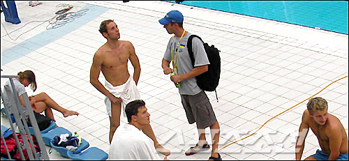 報道說,水立方的一邊是跳水場館,一邊是游泳場館,選手們的更衣室設(shè)在場館外面的走廊。外國選手尤其是歐美男子選手們經(jīng)常在賽場內(nèi)換泳褲,而且還毫不顧忌地和女隊友們邊聊邊換。當(dāng)然基本程序是,用浴巾遮住主要部位,然后脫掉泳褲,再換上運(yùn)動服。但是,由于這套“業(yè)務(wù)”進(jìn)行得不是很精細(xì),只能大概換一下衣服,所以偶爾會出現(xiàn)有尷尬場面,就是主要部位經(jīng)常會走光。