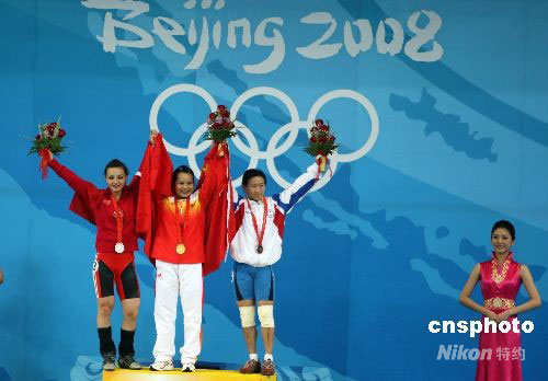 8月9日上午,中國舉重選手陳燮霞在北京奧運(yùn)會女子舉重48公斤級決賽中以總成績212公斤打破奧運(yùn)會記錄,力壓各路群芳獲得冠軍,土耳其選手西貝爾·厄茲坎(OZKAN Sibel)獲得銀牌,中華臺北選手陳葦綾(右)獲得銅牌。中新社發(fā) 任晨鳴 攝