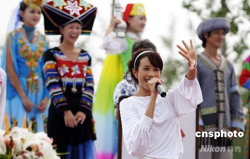 8月9日,大型文化展示活動《中國故事》在北京奧林匹克公園公共區(qū)正式開幕,香港影視歌三棲明星莫文蔚與少數(shù)民族演員同臺演出。中新社發(fā) 王東明 攝