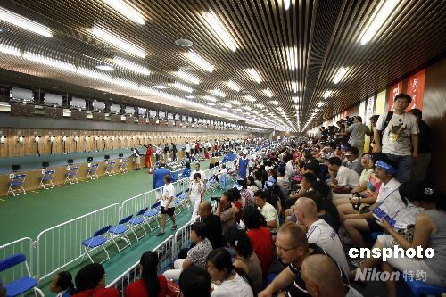 北京奧運會射擊男子10米氣手槍資格賽在北京射擊館舉行,參賽的中國選手龐偉晉級決賽,老將譚宗亮發(fā)揮欠佳慘遭淘汰。圖為觀眾在賽場內(nèi)觀看比賽。中新社發(fā) 盛佳鵬 攝