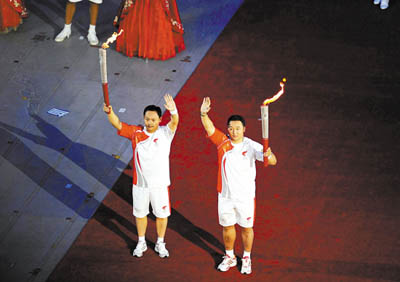 “鳥巢”內(nèi)的傳遞只有8名火炬手,兩屆奧運會舉重冠軍、浙江籍運動員占旭剛幸運地成為第4棒火炬手。