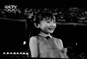 “五星紅旗迎風(fēng)飄揚,勝利歌聲多么響亮……”清澈的童音響徹“鳥巢”上空,昨晚8時6分,北京奧運會開幕式升旗儀式前,一名身著紅色紗裙的女孩出現(xiàn)在電視畫面中,她緊攥拳頭,領(lǐng)唱《歌唱祖國》,隨后,代表56個民族的少年起舞、五星紅旗升起。