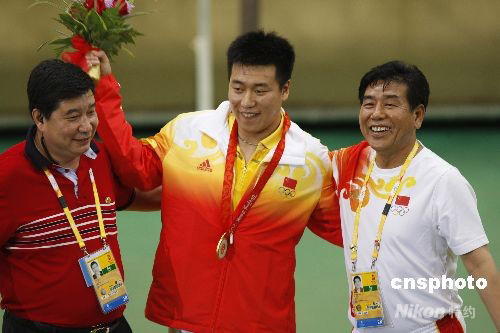 8月9日,北京奧運(yùn)會(huì)射擊比賽男子10米氣手槍決賽在北京射擊館結(jié)束,中國(guó)隊(duì)22歲河北小將龐偉(中)獲得冠軍。圖為頒獎(jiǎng)結(jié)束后,龐偉與教練王義夫(左)、陳繼元(右)合影,分享奪冠的喜悅。中新社發(fā) 盛佳鵬 攝