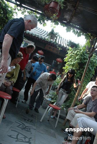 圖為奧地利游客8月9日下午游覽北京金絲胡同的四合院時,觀賞主人在地上用水寫的歡迎書法。 中新社發(fā) 王辛莉 攝
