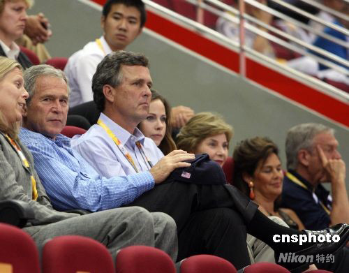 8月9日晚,雅典奧運(yùn)會冠軍美國女籃在北京奧運(yùn)會籃球館——五棵松體育館開始衛(wèi)冕之旅,美國總統(tǒng)布什一家悄悄來臨,坐在奧林匹克大家庭普通看臺上觀看比賽,為美國女籃加油。中新社發(fā) 任晨鳴 攝