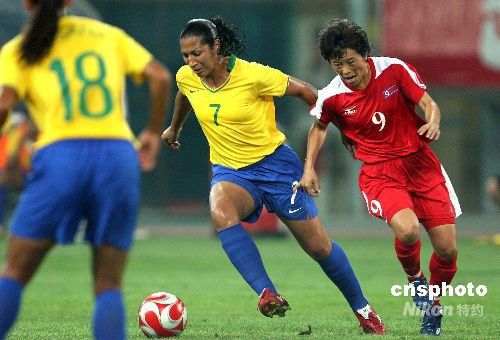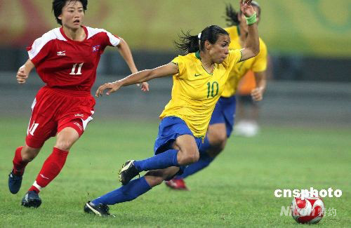 8月9日,北京奧運(yùn)會(huì)沈陽(yáng)分賽場(chǎng)舉行女足預(yù)賽,巴西隊(duì)最終以2:1勝朝鮮隊(duì)。巴西球星瑪塔打入第二粒進(jìn)球。 中新社發(fā) 張宇 攝