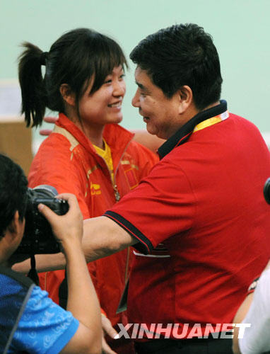 中國(guó)選手郭文珺(左)與中國(guó)射擊隊(duì)總教練王義夫擁抱,慶祝勝利。新華社記者 李尕?cái)z(來(lái)源:新華網(wǎng))