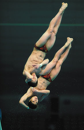 在2007年贏得世錦賽冠軍時(shí),林躍/火亮組合的4個(gè)自選動(dòng)作難度系數(shù)總和為13.3,當(dāng)時(shí)總分為489.48分。其中,裁判在比賽過程中共出示了18個(gè)10分滿分,可見兩人實(shí)力之強(qiáng)大。在今年2月“好運(yùn)北京”第16屆跳水世界杯賽上,兩人再次折桂。不同的是,這次他們將原本壓軸的307C調(diào)整到倒數(shù)第二跳,將壓軸跳留給了難度系數(shù)高達(dá)3.8的5255B。這樣一來,難度只有3.3的207C被取代,兩人的難度系數(shù)總和也上升到13.8,在世界跳壇尚難有其他組合能夠比肩!