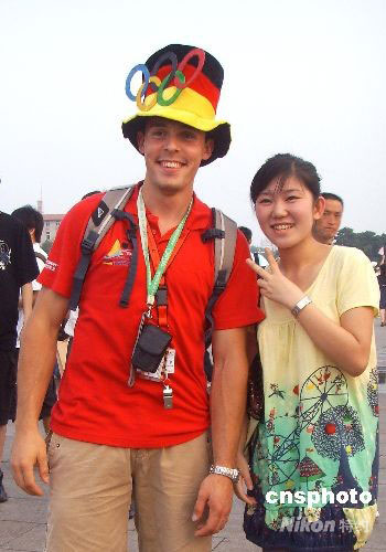 8月9日,幾名參加北京奧運會的德國運動員來到天安門廣場游覽,其中一位運動員頭戴的“奧運五環(huán)”帽十分獨特醒目,引得周圍的游客竟相與他拍照合影。中新社發(fā) 玉龍 攝
