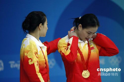8月10日,素有“夢之隊”之稱的中國跳水隊黃金組合郭晶晶和吳敏霞輕松獲得女子雙人三米板金牌。圖為郭晶晶在領(lǐng)獎臺上幫吳敏霞整理衣領(lǐng)。中新社發(fā) 杜洋 攝