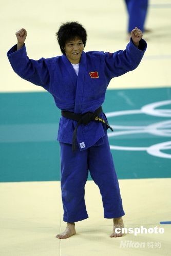 8月10日,北京科技大學(xué)體育館,柔道女子52公斤級(jí)B組決賽冼冬妹獲勝。中新社發(fā) 盛佳鵬 攝