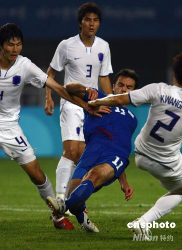 8月10日,北京奧運(yùn)男足預(yù)賽,意大利對(duì)韓國(guó)的比賽在秦皇島奧體中心舉行,上半場(chǎng)意大利2:0領(lǐng)先韓國(guó)隊(duì)。圖為意大利隊(duì)11號(hào)朱塞佩·羅西首先攻破韓國(guó)大門(mén)。 中新社發(fā) 劉新 攝
