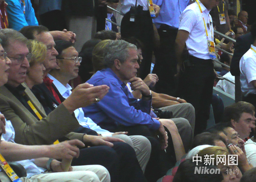 美國(guó)總統(tǒng)布什和家人在中國(guó)外長(zhǎng)楊潔篪的陪同下,在五棵松籃球館觀看比賽。中新社記者 宋方燦 攝