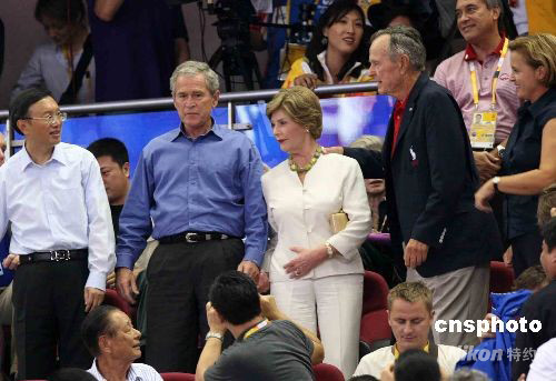 8月10日晚,北京奧運會男子籃球中國隊與美國“夢八隊”之戰(zhàn)在五棵松籃球館舉行,美國總統(tǒng)布什夫婦、老布什夫婦在中國外長楊潔篪陪同下與爆滿的觀眾共同觀看比賽。 中新社記者 宋方燦攝