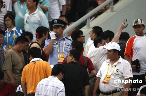 圖為中國(guó)隊(duì)失兩球,少兩名隊(duì)員的情況下,球迷提前退場(chǎng)。中新社發(fā) 張宇 攝