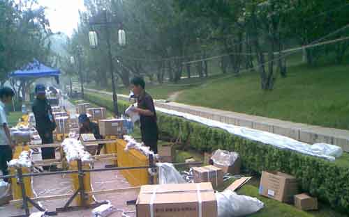 8月8號,早6時30分,負責安裝煙花的工人來到了現(xiàn)場,開始對煙花進行安裝調(diào)試。在安裝調(diào)試的過程中,出現(xiàn)了一個問題,由于現(xiàn)場有很多樹,部分樹枝可能會阻擋煙花發(fā)現(xiàn)的路徑,導致煙花不能正常發(fā)射,甚至造成火災。為了防止這種事故的發(fā)生,消防官兵對發(fā)射炮一一的做了檢查,認真計算其發(fā)現(xiàn)的軌道,盡量避免在發(fā)射軌道中出現(xiàn)樹枝等阻擋物。如果遇到實在不能避免的樹枝,即迅速與當?shù)叵嚓P(guān)人員聯(lián)系,給與解決。通過大家的統(tǒng)統(tǒng)努力,所有的煙花在8月8號上午11點50分完成了安裝調(diào)試。到這時,消防官兵已經(jīng)連續(xù)工作了15個小時,但是消防官兵知道現(xiàn)在還不能休息,只有到煙花綻放在空中那一刻,才能真正地放下心來。