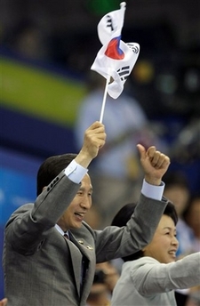 據(jù)韓國(guó)《朝鮮日?qǐng)?bào)》等媒體報(bào)道,9日下午在北京奧林匹克中心舉行的韓國(guó)女子手球隊(duì)同俄羅斯隊(duì)的比賽中,李明博上半場(chǎng)進(jìn)行到中間的時(shí)候入場(chǎng),揮舞韓國(guó)國(guó)旗為韓國(guó)隊(duì)加油。但是,李明博揮舞的韓國(guó)國(guó)旗的太極圖案和四卦上下顛倒。在總統(tǒng)身旁一起加油助威的金潤(rùn)玉女士和文化體育觀光部長(zhǎng)官柳仁村等人的旗幟則正常。