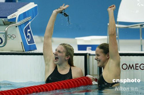 8月11日,北京奧運(yùn)會(huì)女子400米自由泳,英國選手麗貝卡 ·阿德林頓以4分3秒22的成績獲得冠軍(左),隊(duì)友喬安妮·杰克遜(右)以4分3秒52獲得銅牌。中新社發(fā) 杜洋 攝